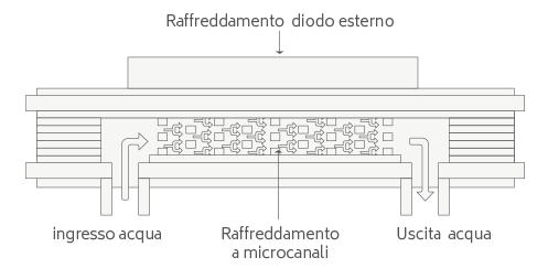 Il raffreddamento a macro-canali è una tecnologia avanzata che minimizza la distanza tra sorgente di calore e il liquido di raffreddamento, aumentando l’efficienza e la durata del manipolo. In questo modo il macchinario viene portato a potenze superiori senza nessun danneggiamento termico né cali di potenza nel lungo periodo.